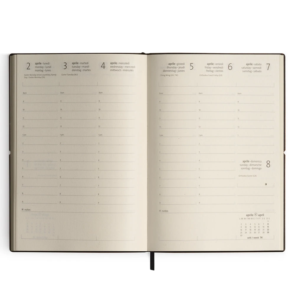 CIAK’s 2024 Weekly Vertical Diary contains one week across two pages, vertically laid out. Containing 72 sheets (160 pages), the planner is printed on recycled ivory paper (80gsm). It is durable and the elastic cover is hand made from ecological leather with attention to every detail. The paper is acid free and with neutral or basic pH, thereby guaranteeing greater durability.Â