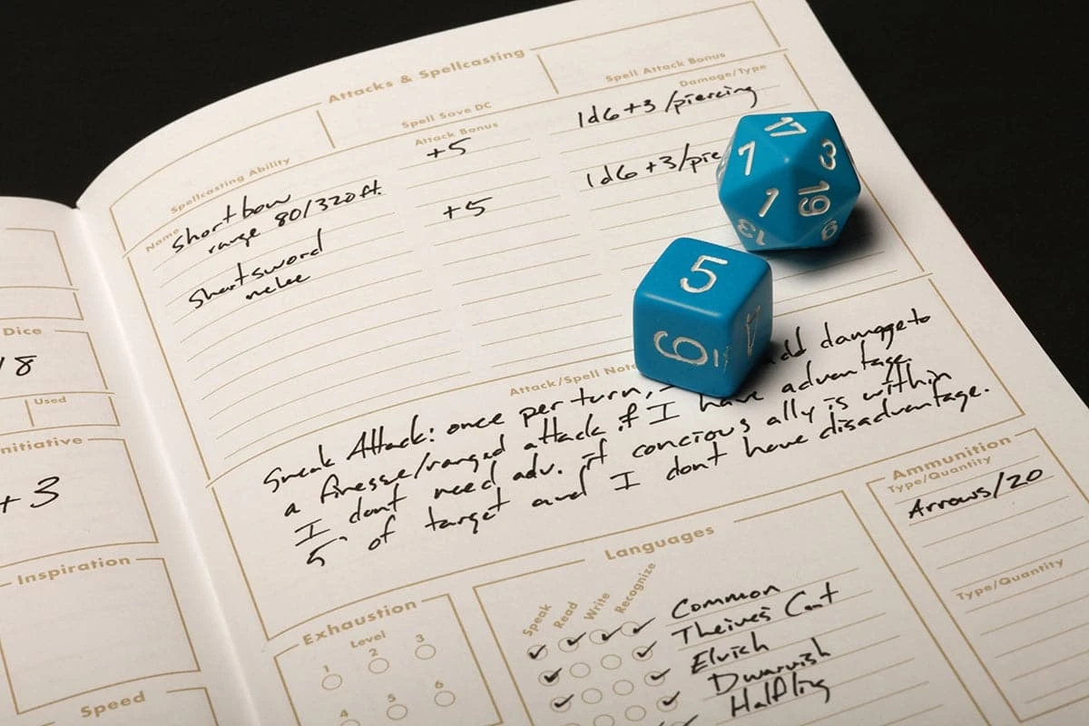 Inside of the journal you’ll find empty charts, tables, and spaces for logging the following character information: