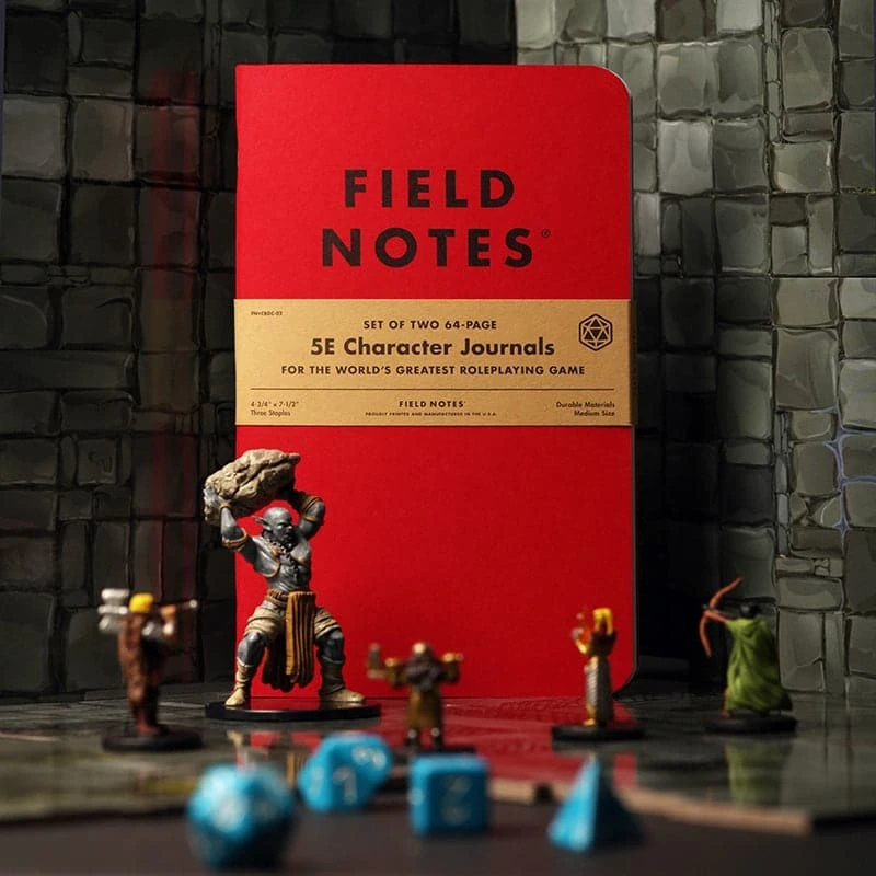 The Field Notes 5E Character Journal is a handsome notebook, made for the fifth edition of Dungeons & Dragons. It is specifically designed to help you track your D&D character’s statistics, spells, weapons, treasure, history, and more. Each book in the 2-Pack is designed to use with one character.