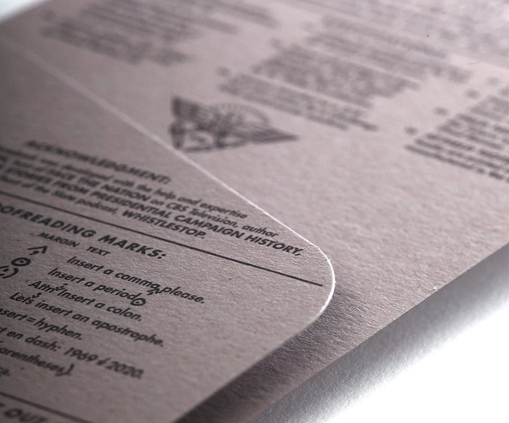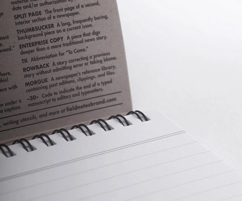 It’s everything you loved about their 2016 limited edition “Byline,” in a permanent edition. The basic specifications remain unchanged, it’s sized perfectly for your hands, easy to write in with one hand while holding it with the other. The cover protects the wire binding, so it doesn’t get caught on fabric or stuff in your backpack. It’s college-ruled for optimal page economy. The diameter of the binding and the die-cut holes that the binding passes through are optimized for maximum “flippability.” The handy pocket in the back cover makes for a thicker, more stable hand-held writing surface, and also gives you a place to stash your receipts and other loose papers. All the useful text packed inside the “Byline” covers remains for “Front Page.”