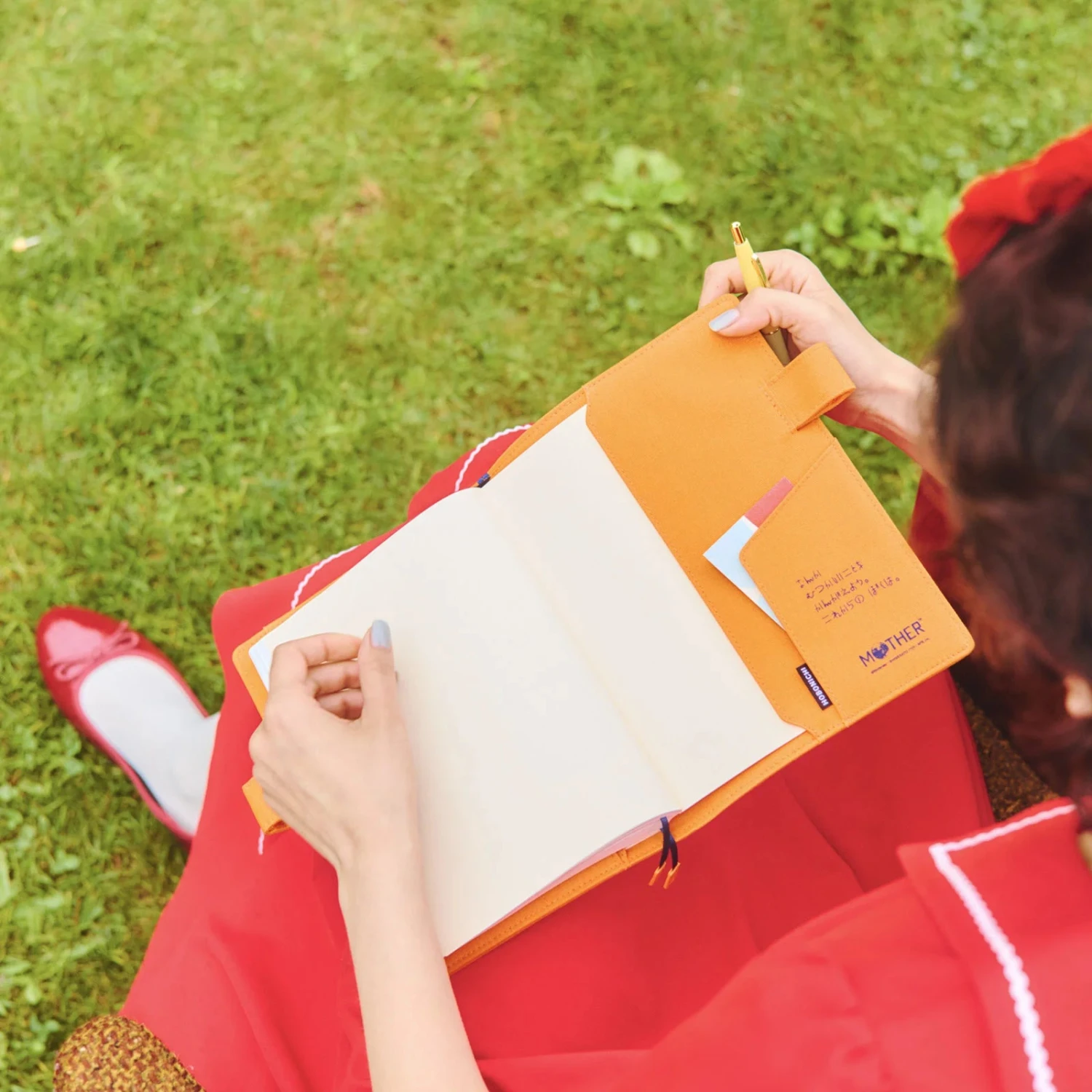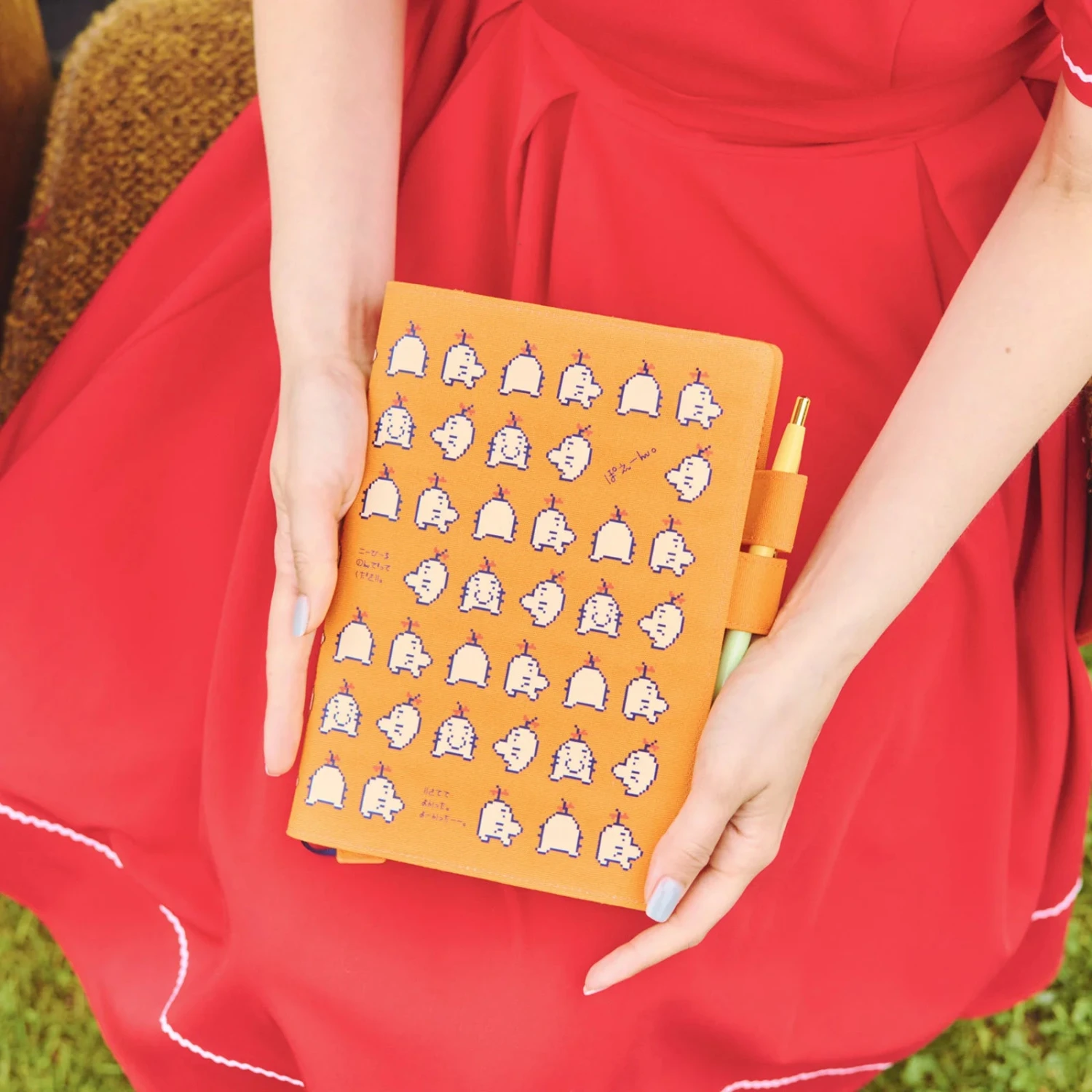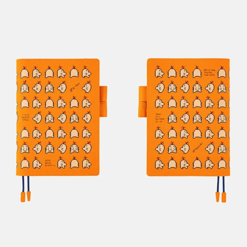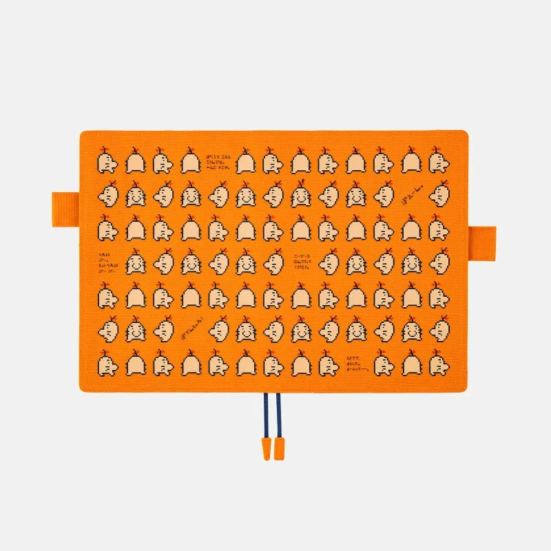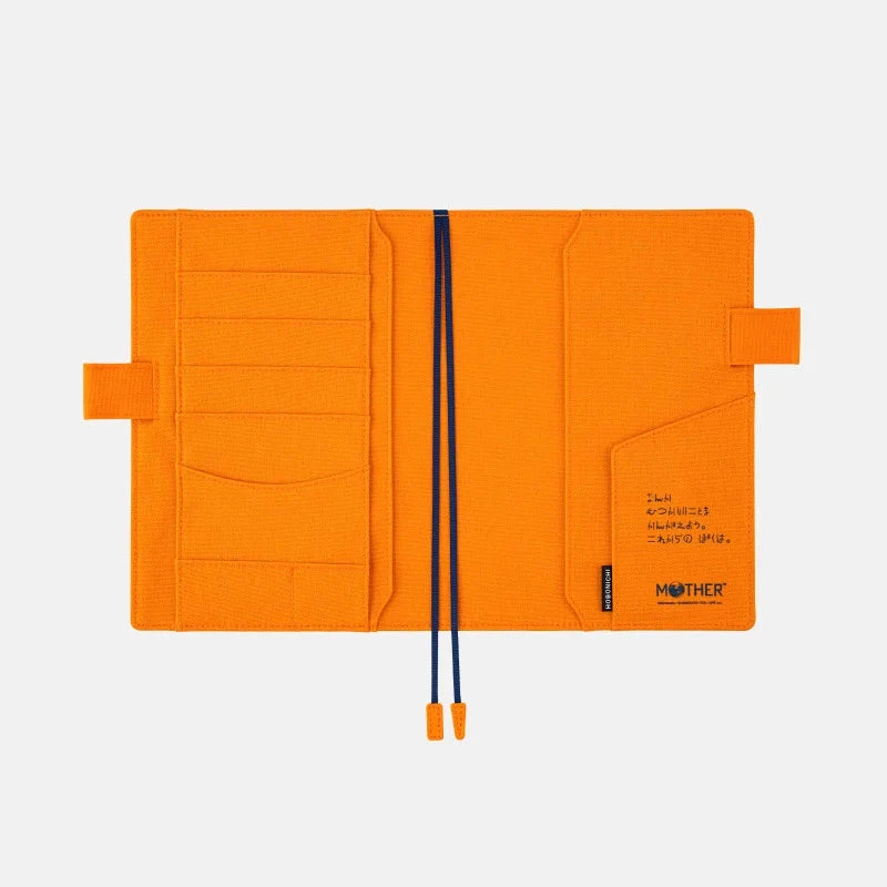 This MOTHER series cover design was made in part by Shigesato Itoi. The A5 size cover is printed with quotes from the Mr. Saturn characters. The orange cotton material has Mr. Saturns walking around it, and between them are occasional quotes printed on the cover.
