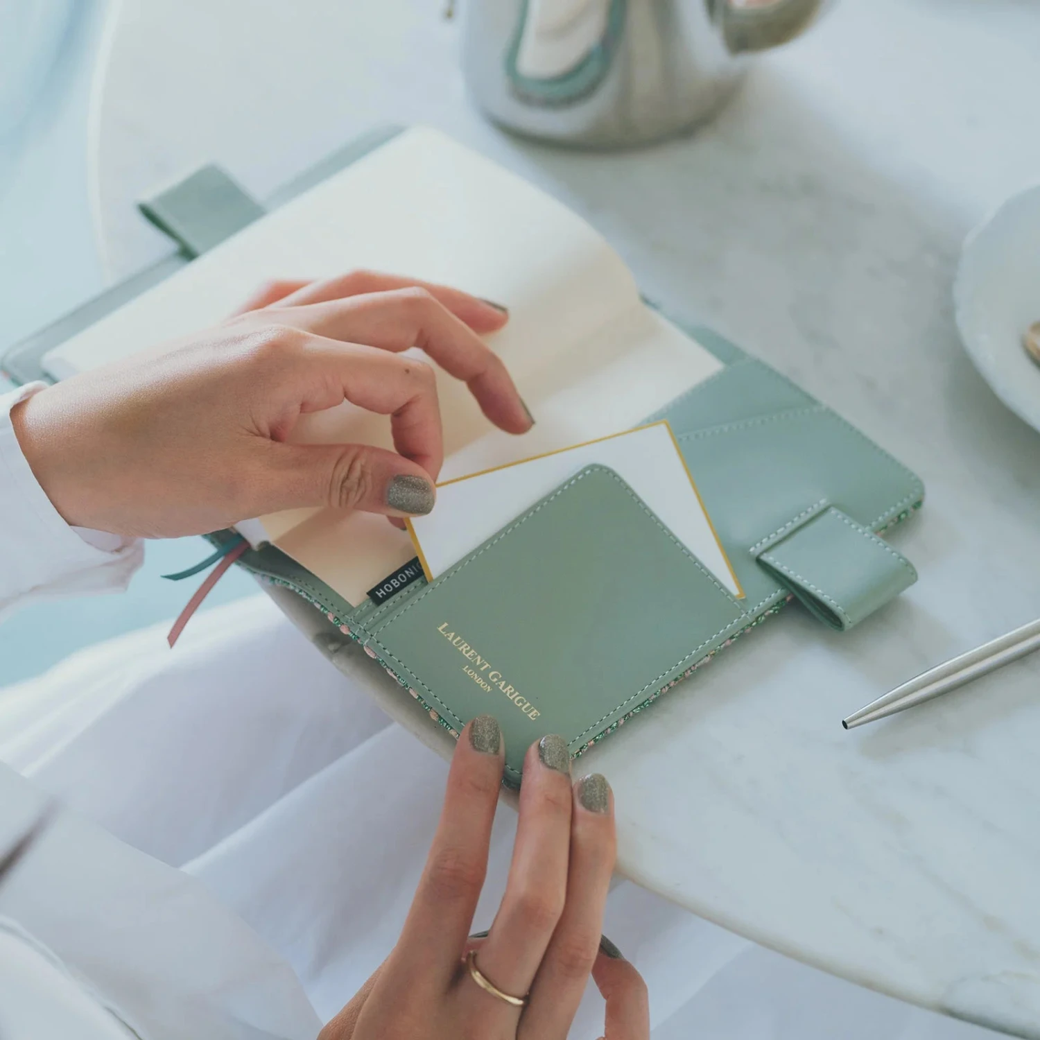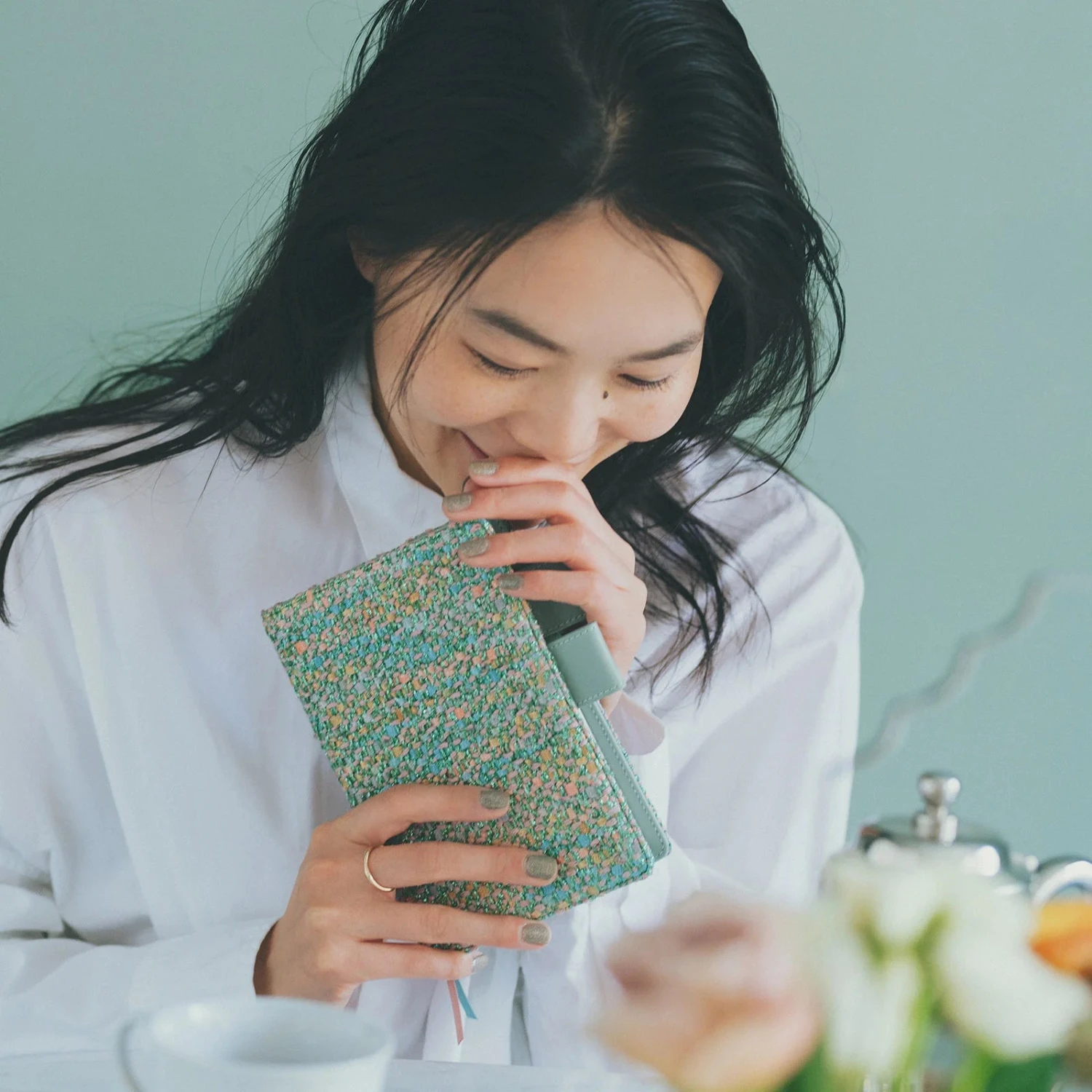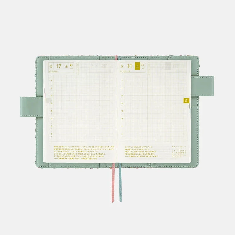 The inner cover and the “butterfly-stopper” pen holders are made of leather for long-lasting use. The smoky green leather will soothe your mind whenever you open your techo. The bookmark has a dull green and pink grosgrain ribbon.