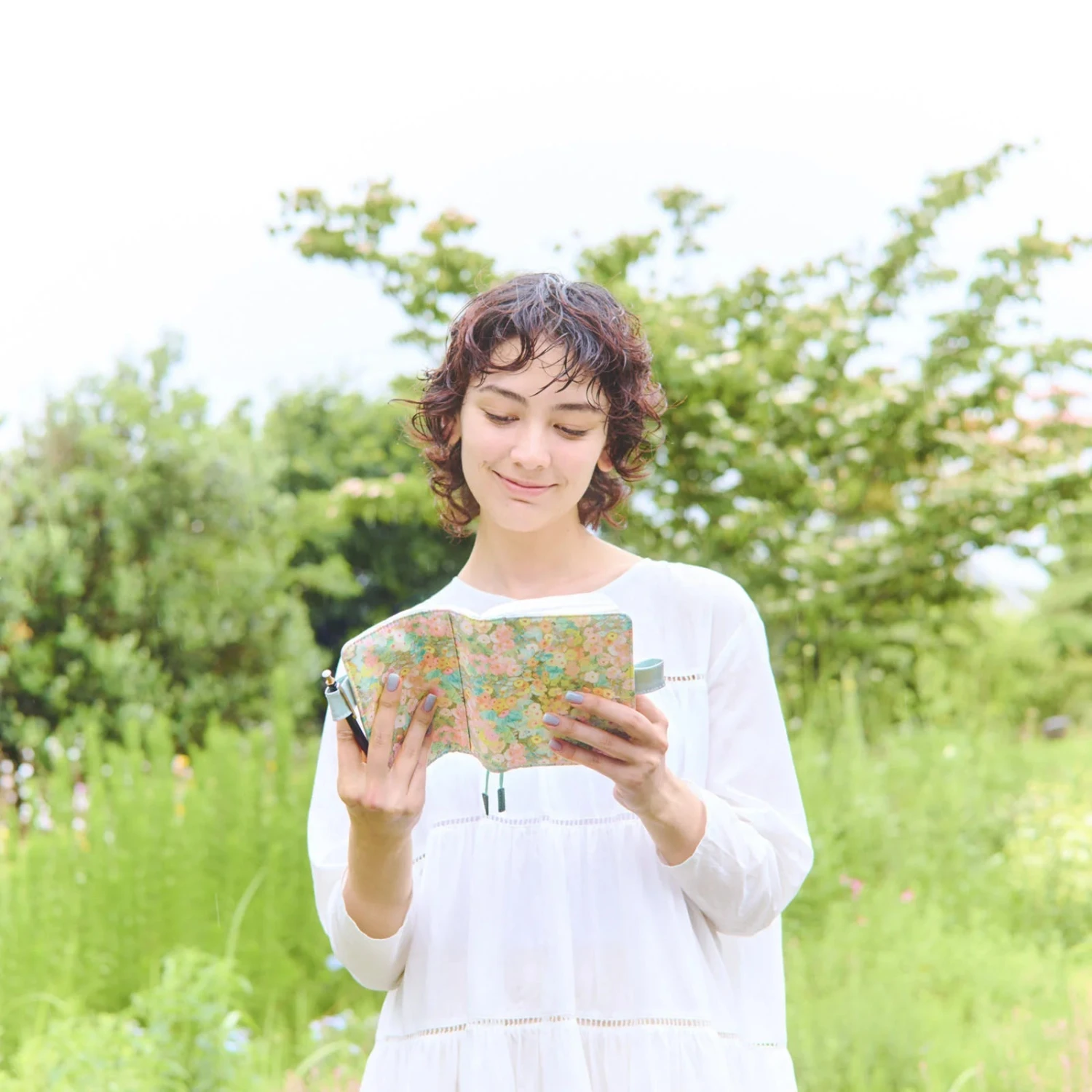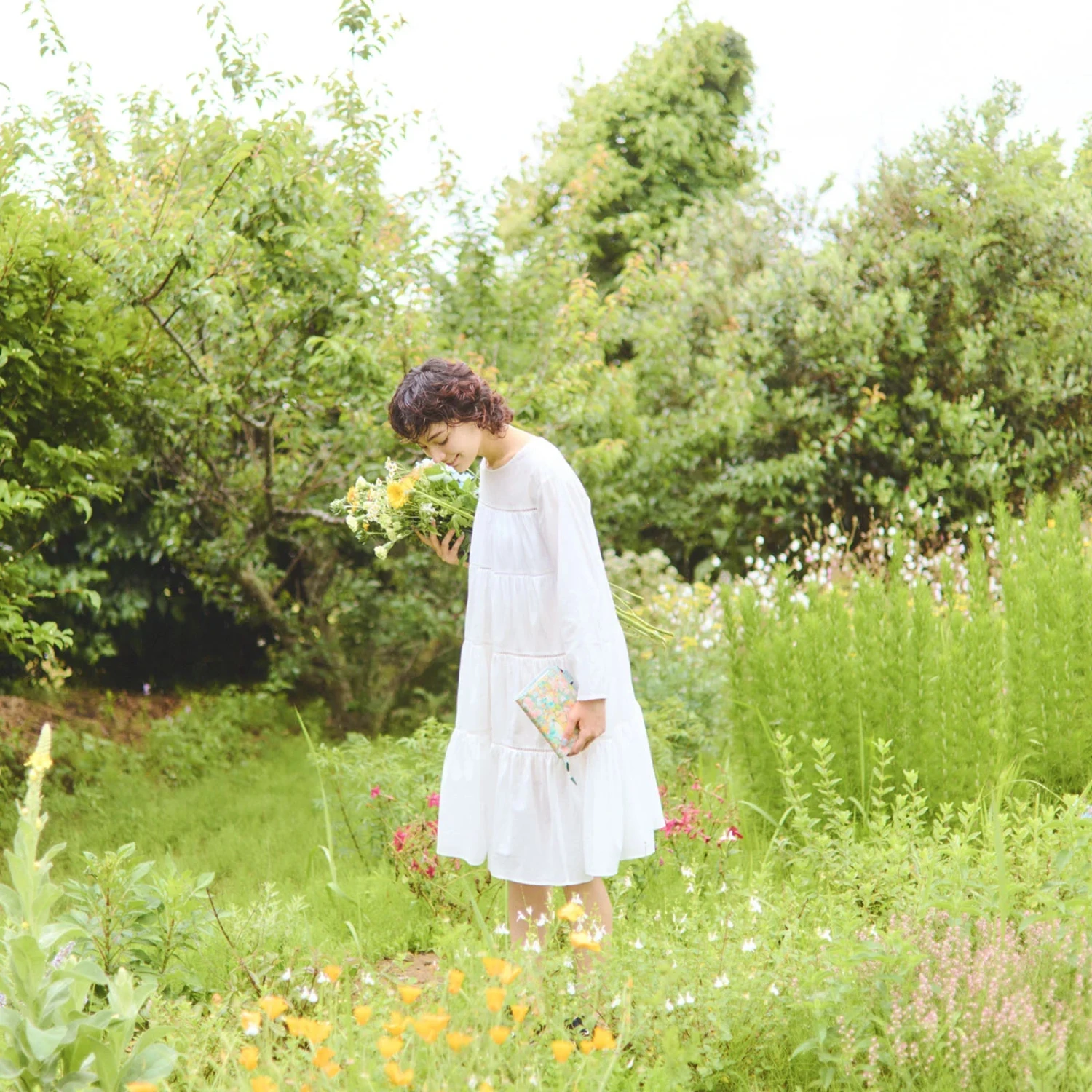 The featured textile for this cover is “Hollyhocks,” inspired by the hollyhock flower that symbolises the English garden. The design expresses innocence, purity, and serenity; the soft colours and touches of watercolour with blotches and shading create a fantastic atmosphere as if it is surrounded by light and shadow.