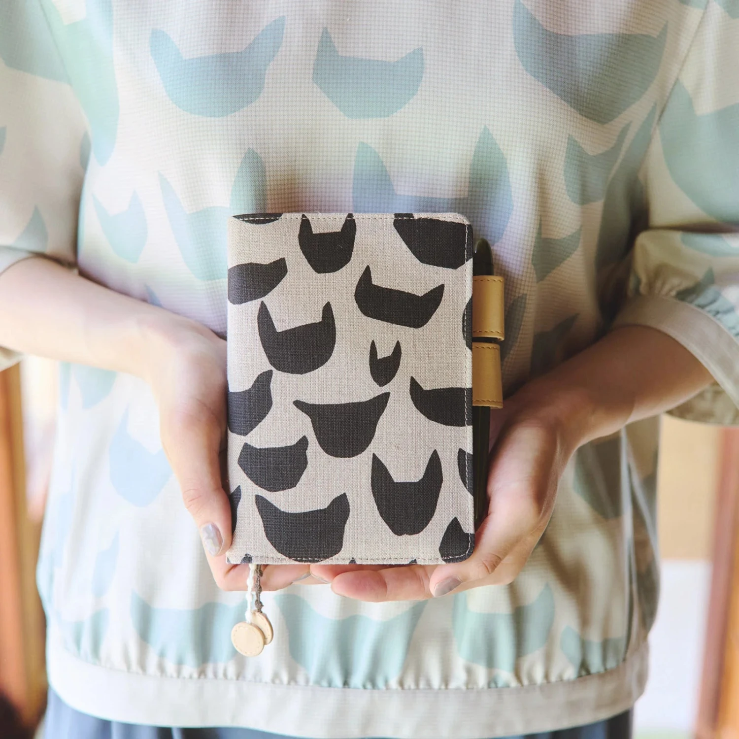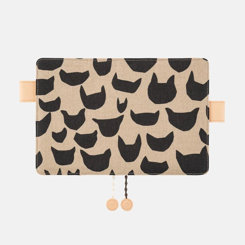 The cats are printed in black on a calm ecru fabric, and the linen material gives you a natural feel. This cover is also suitable for adults without being too cute. The butterfly-stopper pen holders and cover interior are bright beige. Two dotted lace bookmarks are attached.