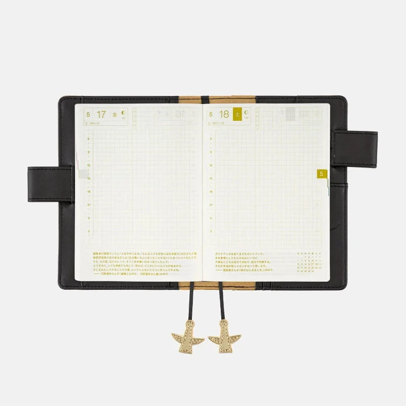 The covers come with two bookmarks with triangular and rectangular charms on the ends (the shape of the charms may differ depending on the cover). It’s useful to use each bookmark to mark different pages, for example using one for the monthly calendar and one for the daily pages.