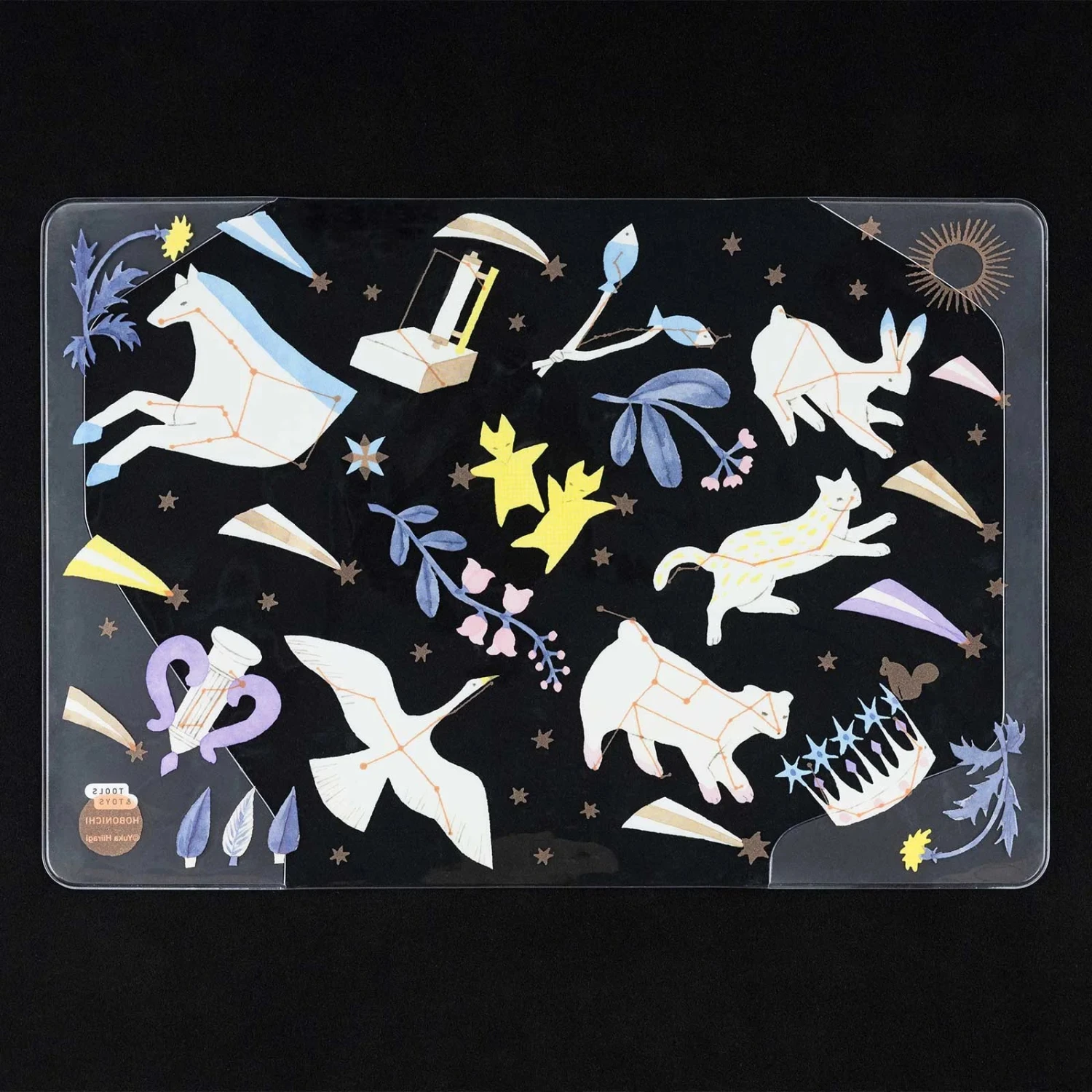The theme of this design is seasonal constellations. Illustrated in gentle, calm colors are various constellations, including Lepus (the hare) in the winter, Ursa Minor (the bear cub, also known as the Little Dipper) in the spring, Cygnus (the swan) in the summer, and Pegasus in the fall. Having a theme with the moon, stars, and sun printed in elegantly shiny copper ink gives this design a nice, mature feel.