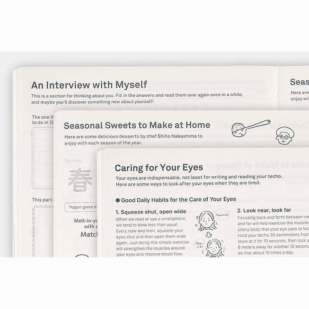 | Bonus Pages | Time Table / Graph Paper / Favorites / My 100 / An Interview with Myself / Seasonal Sweets to Make at Home / Caring for Your Eyes / Words to Remember / 365 Days Check-Off Sheet / Looking Back at the Year 2024 / Getting the Most Out of Your Hobonichi Techo / Gifts / Addresses / Personal Notes |