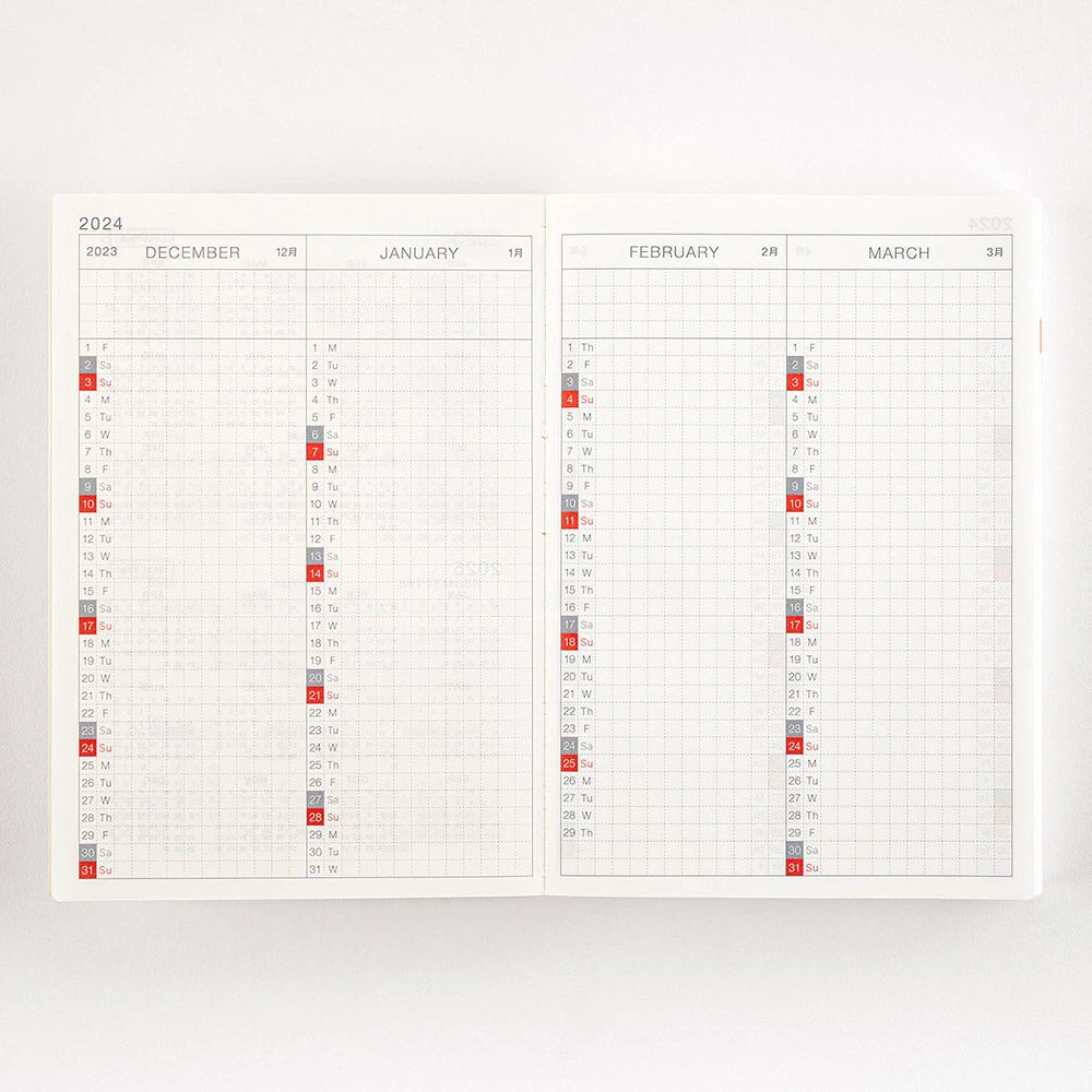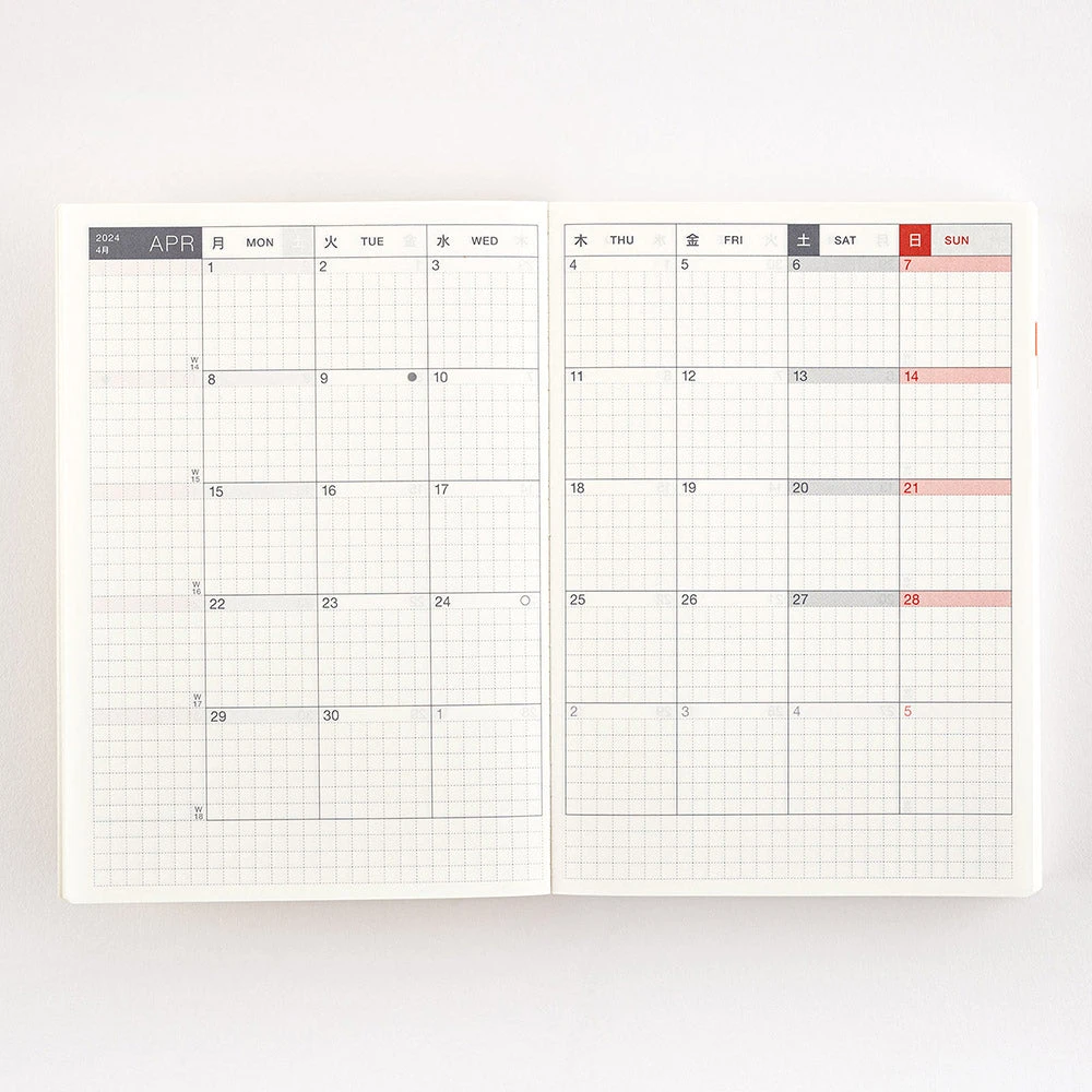 This is the English version of the A6 size Hobonichi Techo Original book with a one page per day format. This original form of the Hobonichi Techo has been loved by many users since its introduction in 2002, and the 2024 edition marks the techo’s 23rd year. This techo has its elements written in English. Its daily pages offer plenty of space to fill despite the book’s compact A6 size. The graph paper offers an open layout for you to neatly lay out writings, clippings, and drawings.