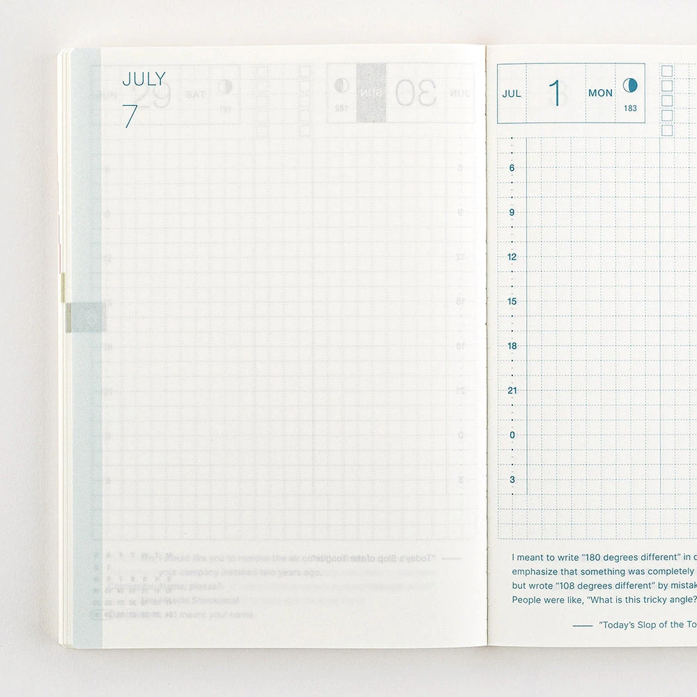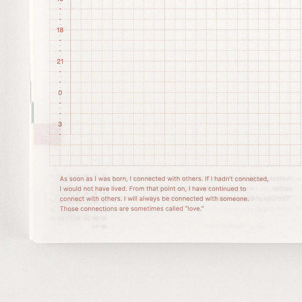 After years of testing, the graph paper has been set to 3.7 mm for optimal writing comfort. The graph paper design allows users to write from any starting point on the page, and the lines have been printed in light colours so users can either customise it to their own layout or ignore it completely. Like with the Japanese version, each month is printed in a different colour.
