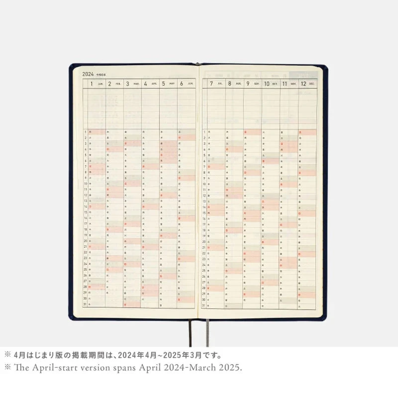 Language Japanese Pages 240 pages Paper Type / Binding Thin, light Tomoe River S paper resistant to bleeding and designed for planners / Stitch-binding Graph Paper Size 3.55 mm Start of Week Monday-start week Yearly Calendar 2023, 2024, 2025 Yearly Index Apr. 2024 – Mar. 2025 (2 pages) Monthly Calendar Mar. 2024 – Apr. 2025 (28 pages) Daily Quotes One per week (Japanese) Weekly Pages Feb. 26, 2024 – Apr. 6, 2025 (116 pages)