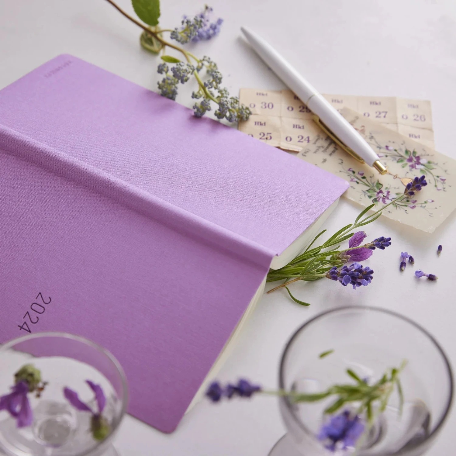 Lavender is a techo in soft and light purple. You can enjoy the combination of different purples with the year 2024 on the cover foil-pressed in purple. They are relaxing colours that make you feel as if you are in a lavender field.