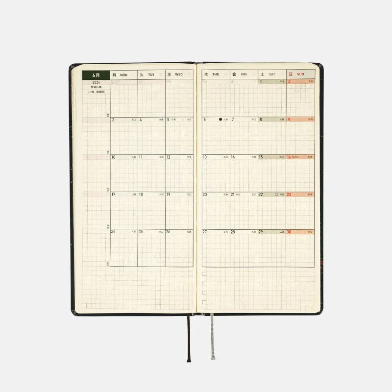 The book uses thin and light yet durable Tomoe River S paper. The paper has supported the Hobonichi Techo for over 20 years with its special characteristics, but it’ll be undergoing an overhaul starting with the 2024 edition techos. The paper is more resistant to bleed through, lighter despite being the same thickness, and has a smoother surface by adjusting the fibers of the paper.