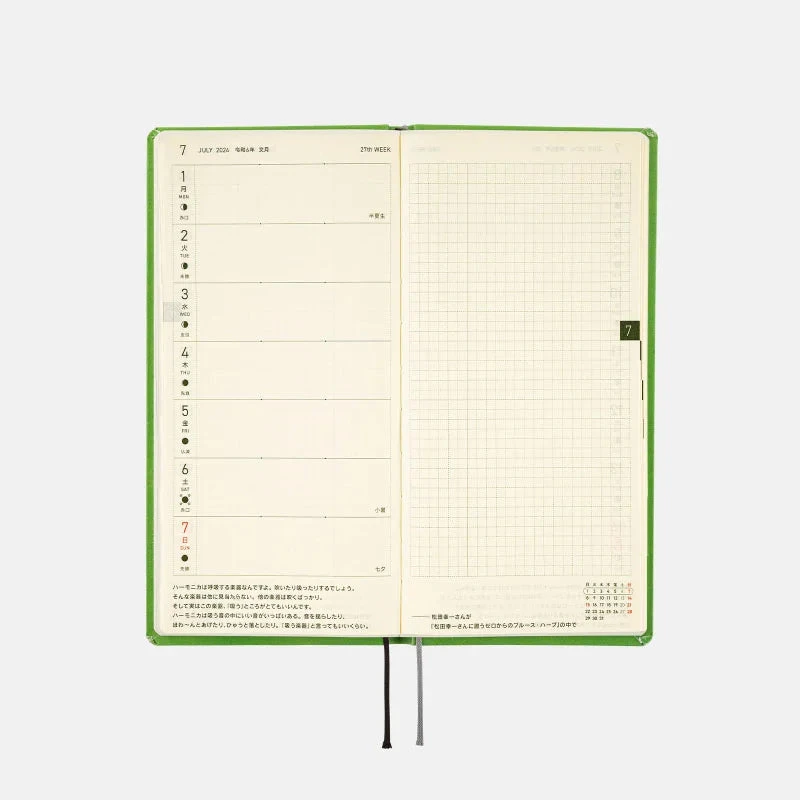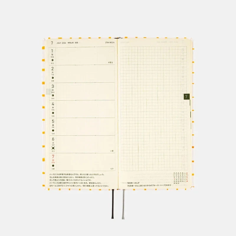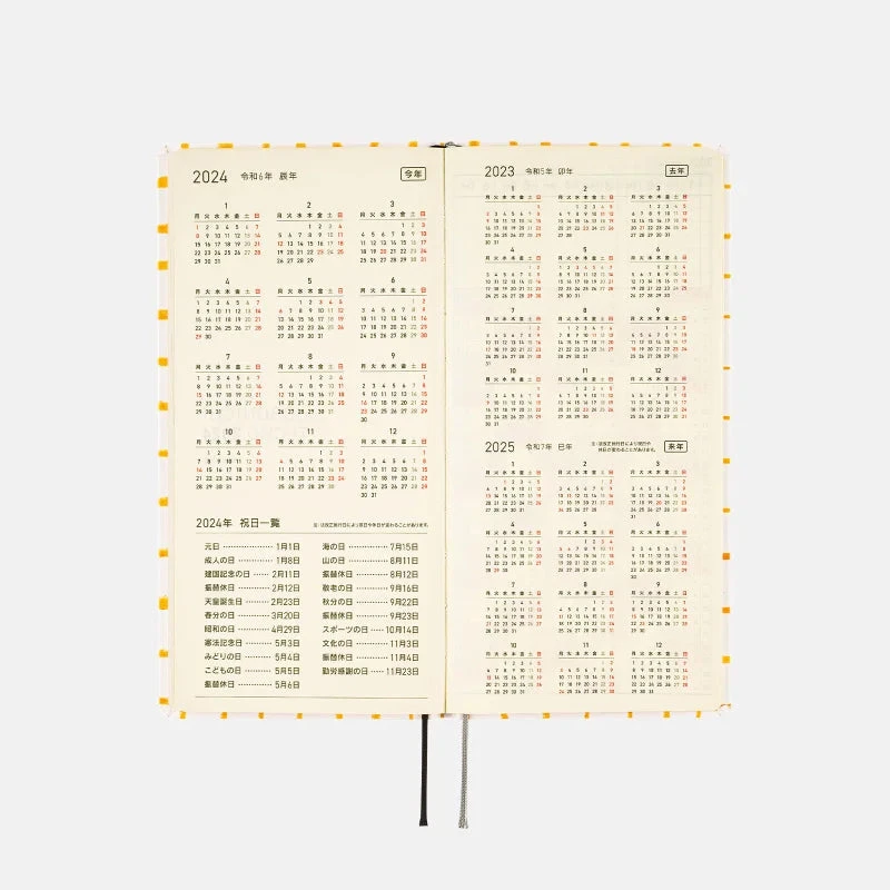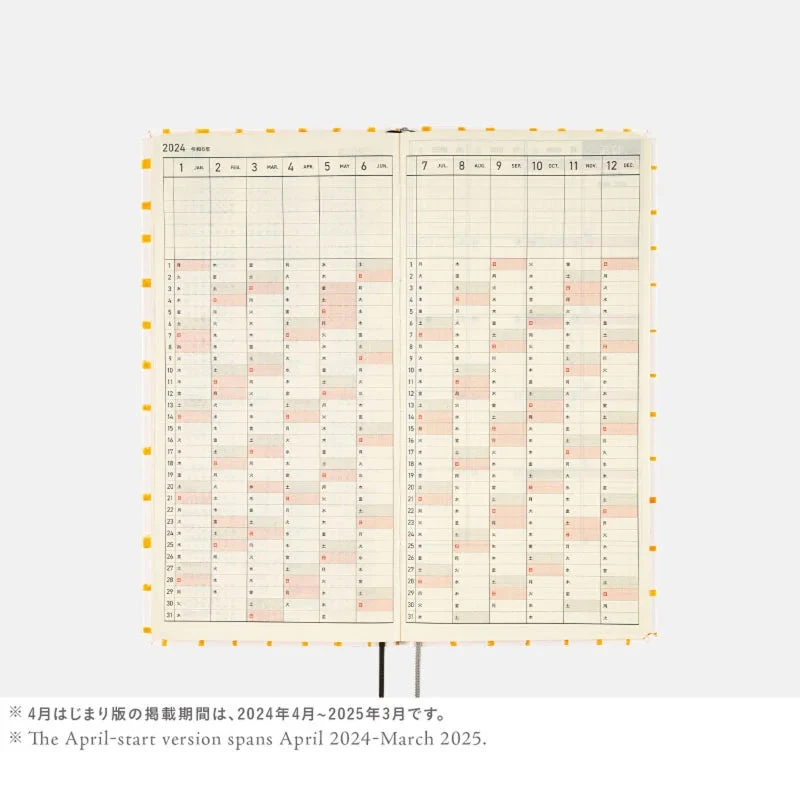 Language Japanese Pages 240 pages Paper Type / Binding Thin, light Tomoe River S paper resistant to bleeding and designed for planners / Stitch-binding Graph Paper Size 3.55 mm Start of Week Monday-start week Yearly Calendar 2023, 2024, 2025 Yearly Index Apr. 2024 – Mar. 2025 (2 pages) Monthly Calendar Mar. 2024 – Apr. 2025 (28 pages) Daily Quotes One per week (Japanese) Weekly Pages Feb. 26, 2024 – Apr. 6, 2025 (116 pages)