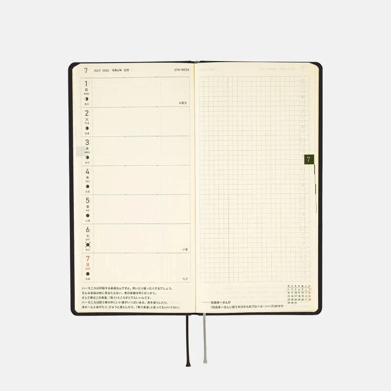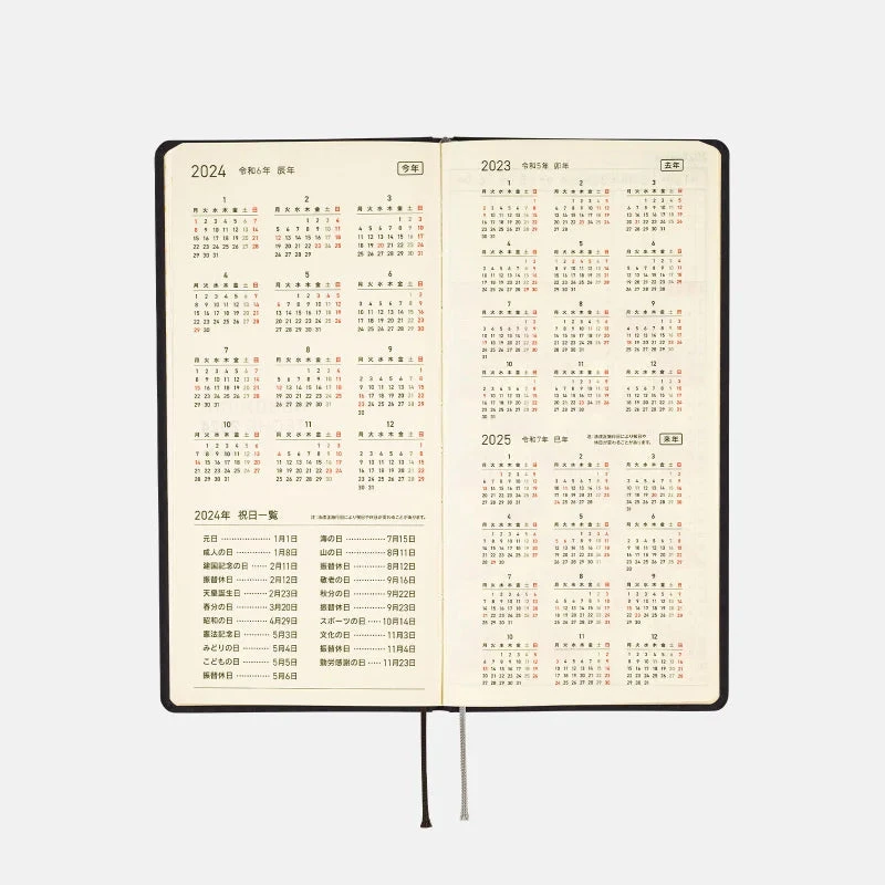 Language Japanese Pages 240 pages Paper Type / Binding Thin, light Tomoe River S paper resistant to bleeding and designed for planners / Stitch-binding Graph Paper Size 3.55 mm Start of Week Monday-start week Yearly Calendar 2023, 2024, 2025 Yearly Index Apr. 2024 – Mar. 2025 (2 pages) Monthly Calendar Mar. 2024 – Apr. 2025 (28 pages) Daily Quotes One per week (Japanese) Weekly Pages Feb. 26, 2024 – Apr. 6, 2025 (116 pages)