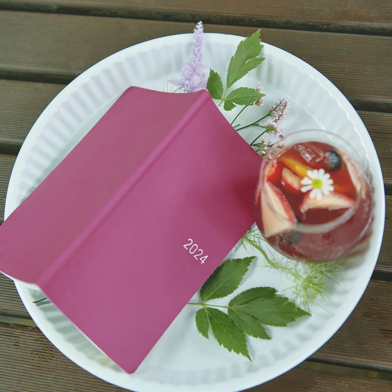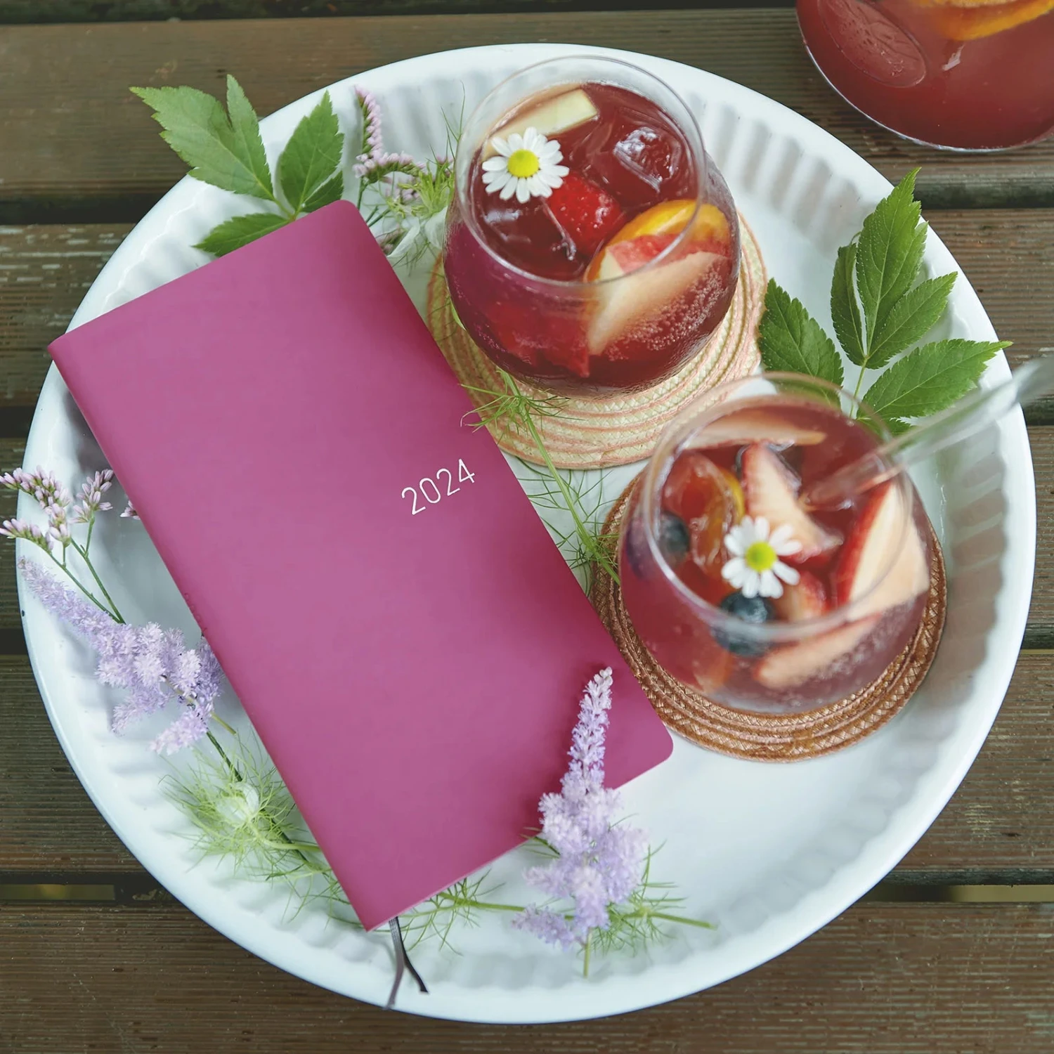Sangria is in a red-purple color that evokes the image of wine. The color is flamboyant like a sangria that’s added with fruits and spices. The year 2024 is in white.
