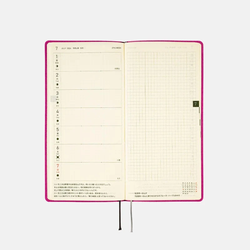 Language Japanese Pages 240 pages Paper Type / Binding Thin, light Tomoe River S paper resistant to bleeding and designed for planners / Stitch-binding Graph Paper Size 3.55 mm Start of Week Monday-start week Yearly Calendar 2023, 2024, 2025 Yearly Index Apr. 2024 – Mar. 2025 (2 pages) Monthly Calendar Mar. 2024 – Apr. 2025 (28 pages) Daily Quotes One per week (Japanese) Weekly Pages Feb. 26, 2024 – Apr. 6, 2025 (116 pages)