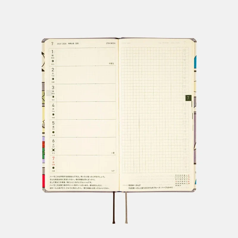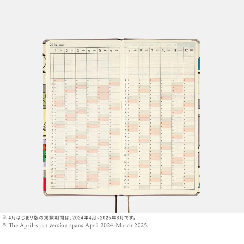 Language Japanese Pages 240 pages Paper Type / Binding Thin, light Tomoe River S paper resistant to bleeding and designed for planners / Stitch-binding Graph Paper Size 3.55 mm Start of Week Monday-start week Yearly Calendar 2023, 2024, 2025 Yearly Index Apr. 2024 – Mar. 2025 (2 pages) Monthly Calendar Mar. 2024 – Apr. 2025 (28 pages) Daily Quotes One per week (Japanese) Weekly Pages Feb. 26, 2024 – Apr. 6, 2025 (116 pages)