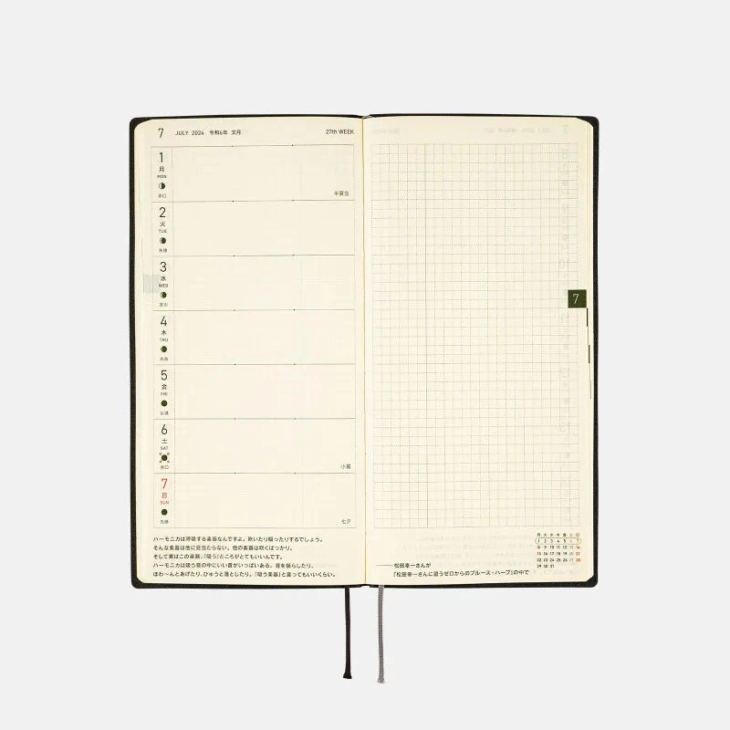 Language Japanese Pages 240 pages Paper Type / Binding Thin, light Tomoe River S paper resistant to bleeding and designed for planners / Stitch-binding Graph Paper Size 3.55 mm Start of Week Monday-start week Yearly Calendar 2023, 2024, 2025 Yearly Index Apr. 2024 – Mar. 2025 (2 pages) Monthly Calendar Mar. 2024 – Apr. 2025 (28 pages) Daily Quotes One per week (Japanese) Weekly Pages Feb. 26, 2024 – Apr. 6, 2025 (116 pages)