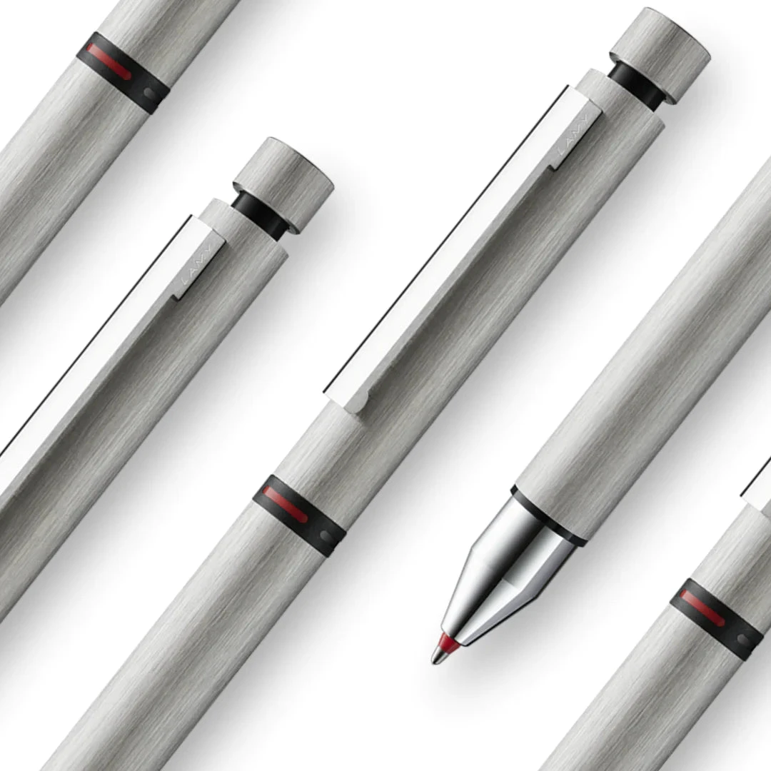 An especially slender, cylindrical writing instrument with massive, spring-action stainless steel clip. 3 in 1; twist-action mechanism; brushed stainless steel; with refill LAMY M21 black and red; pencil lead LAMY M 41 (0.5); eraser LAMY Z 15.