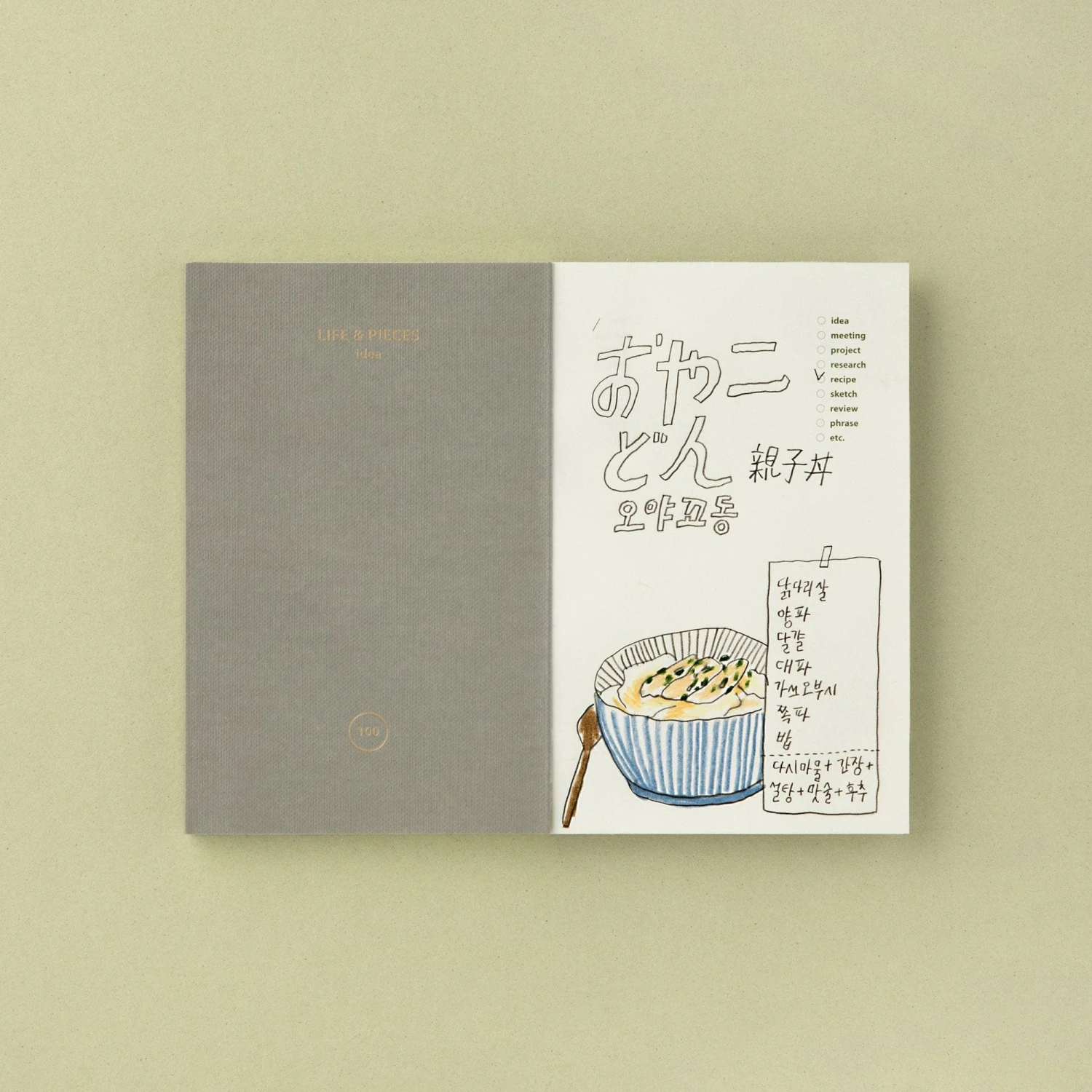 - Each page features a checkboxes for 9 categories: idea, meeting, project, research, recipe, sketch, review, phrase, “etc.”