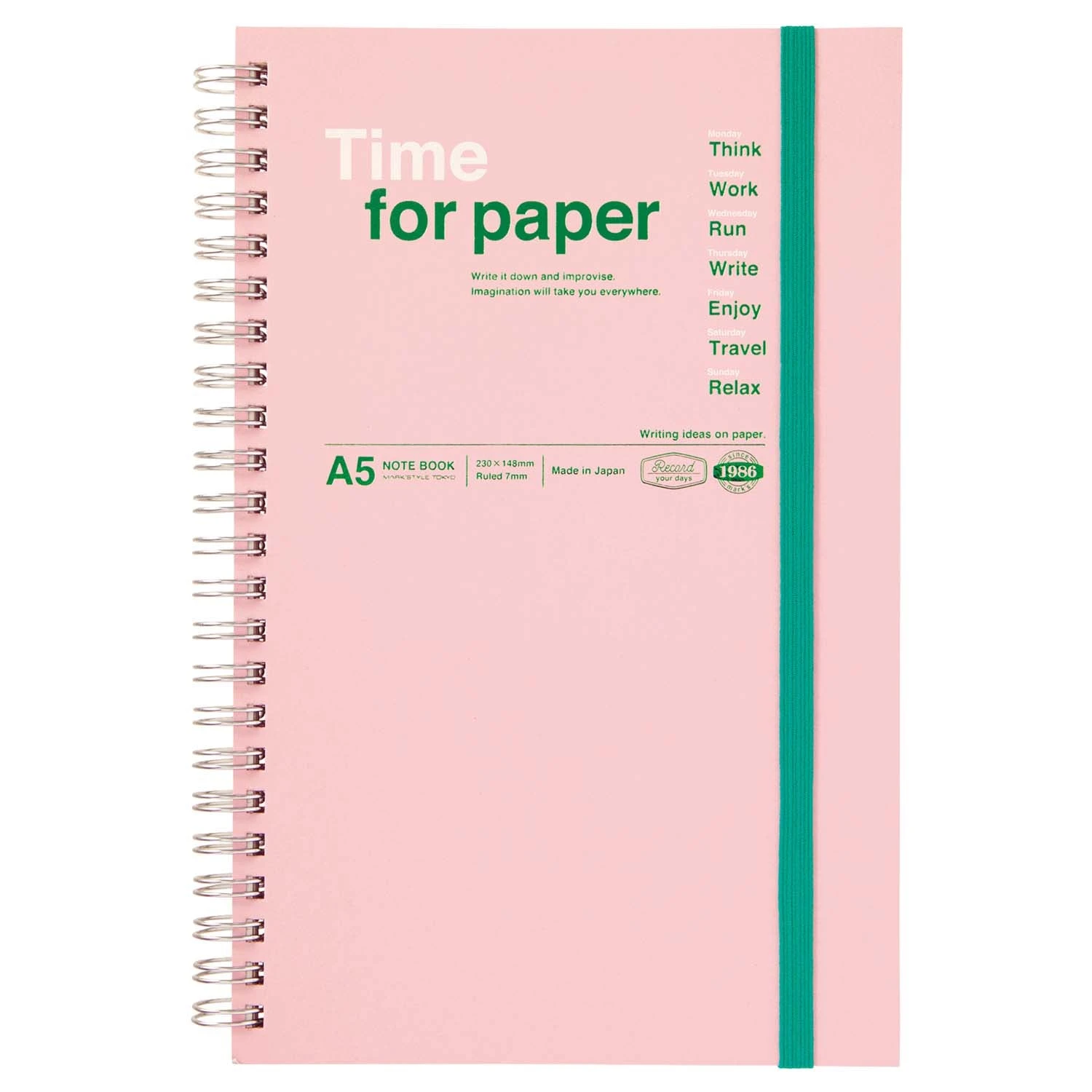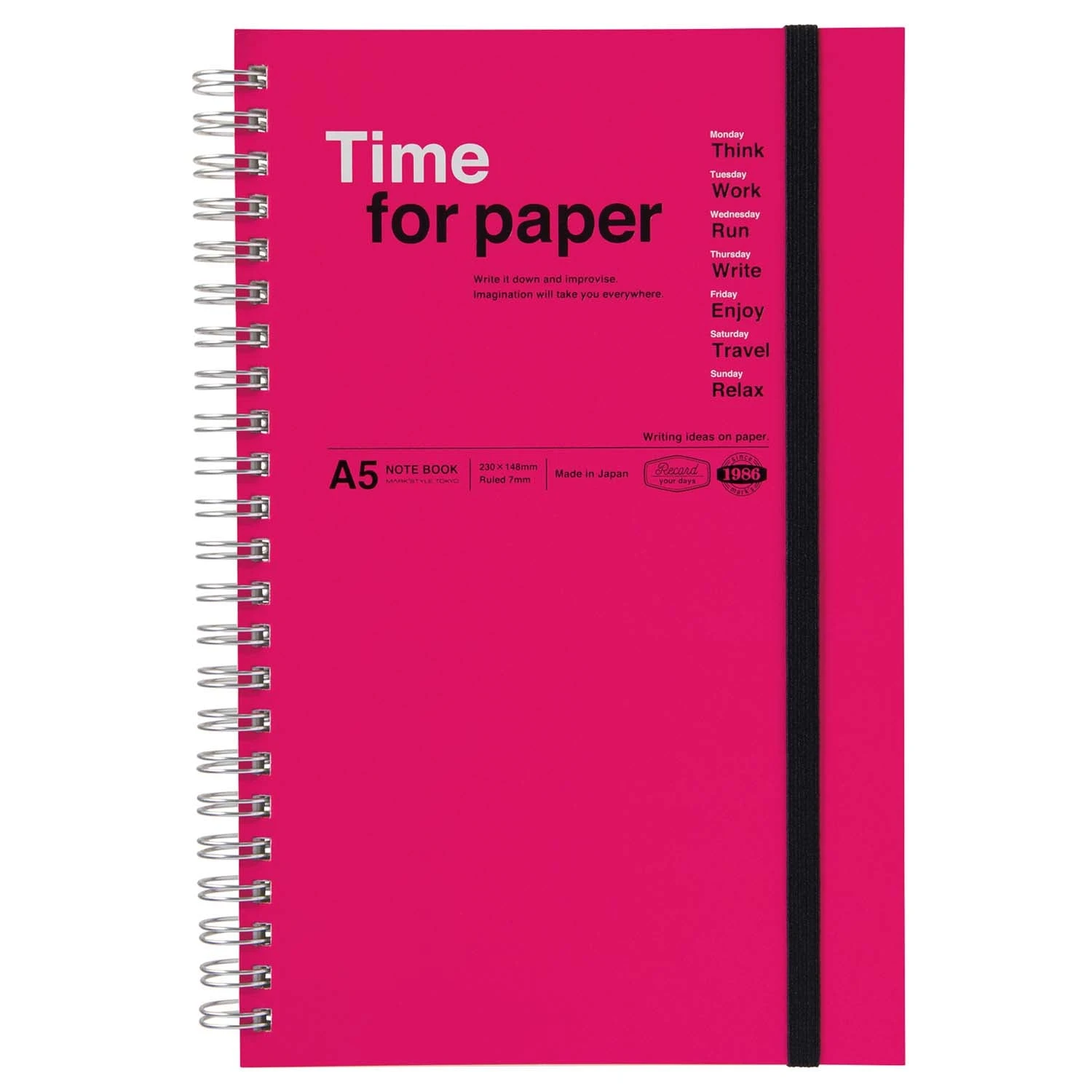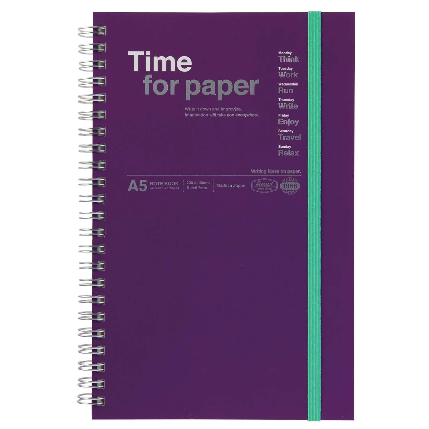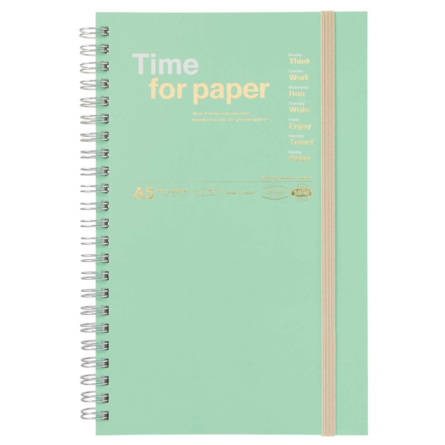 Made with high-quality writing paper in Japan, this A5 notebook closes with the use of a band which makes the Time for Paper notebook the perfect companion to take quick notes on the go. The notebook is spiral bound so it opens flat (our favourite type of notebook!) and gives you the freedom to spread out a bit when writing without having to worry about keeping your notebook open with clips.Â