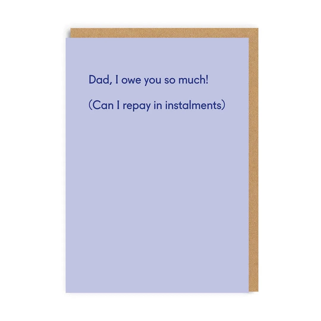 Say “happy Father’s Day” like you mean it with this witty and thoughtful Father’s Day card! The perfect way to show that Dad is owed more than just a card!