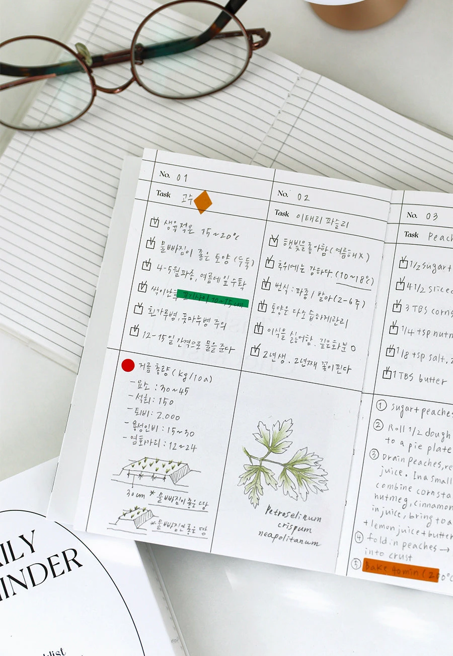 - Comprehensive layout: Daily checklists, focused task checklists, and free note sections.