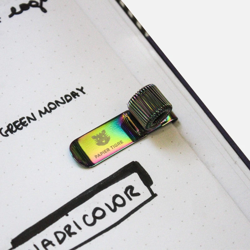 Introducing the Papier Tigre Pen Holder Clip, the perfect companion for your notebook, allowing you to keep your favourite pen or pencil right where you need it. This metal clip, available in four stylish colours – Rose Gold, Black, Iridescent and Silver – securely attaches to any type and size of notebook, be it hard or soft cover.