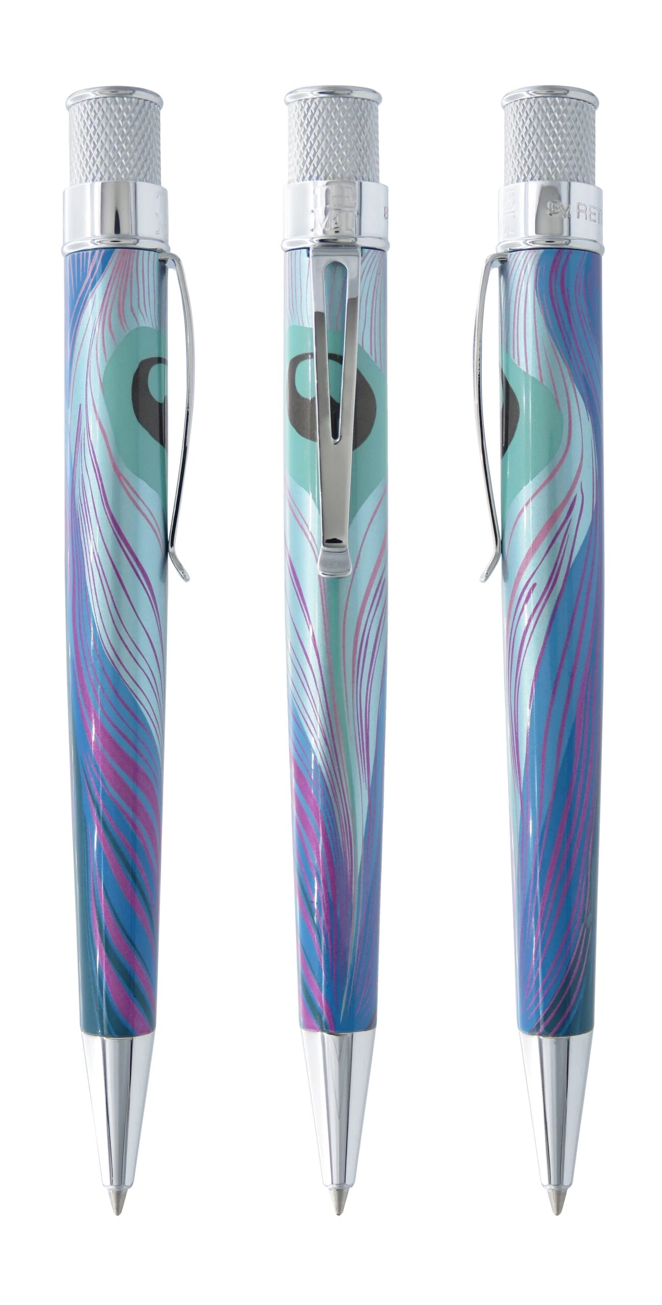 Tiffany’s Favrile Tornado rollerball pen recalls an iridescent Favrile glass vase (ca. 1900) with a peacock feather motif, produced by the Tiffany Glass and Decorating Company (American, 1892–1902). It’s been printed with shimmering metallic inks finished with chrome accents.