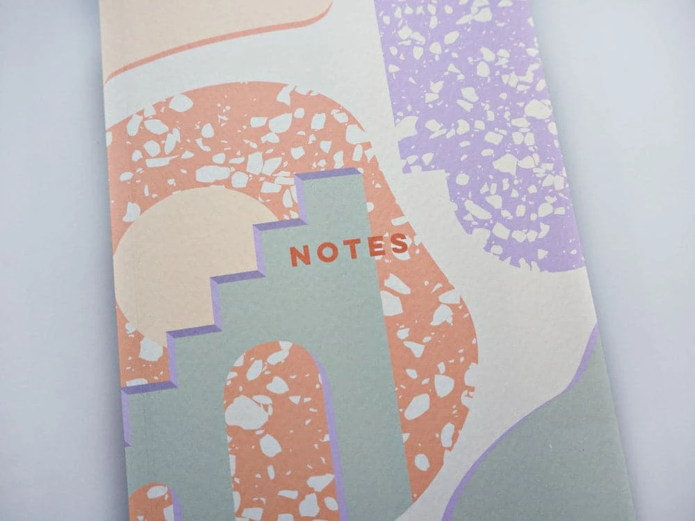 Looking for the perfect notebook? This is the one for you. It features an abstract architectural terrazzo print and has a contrast peach coloured inside cover.Â