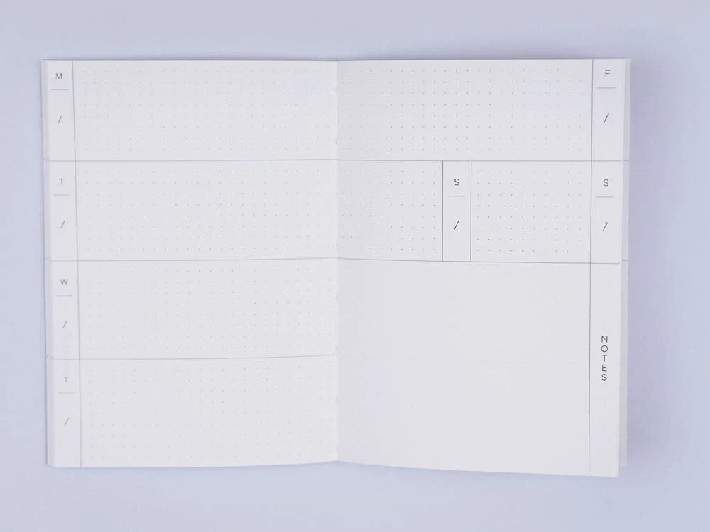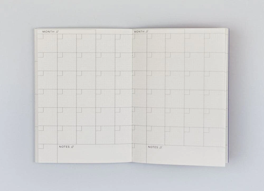 This pocket planner is perfect for putting in your… pocket. Great for when you’re on the go and just need something small to keep you organised.It has a week per spread and 12 month pages – there’s 52 weeks in total and it comes with a matching bookmark. It’s made by a family run music book maker right here in the U.K., and the inside sheets are made from music sheet paper. The soft cover is a luxurious, textured 250gsm G.F. Smith card. The book itself has special binding that means it will lay flat on the table (perfect for left-handed people who struggle to use the start of notebooks!) and comes packed in a card folio box, custom designed in conjunction with G.F. Smith.