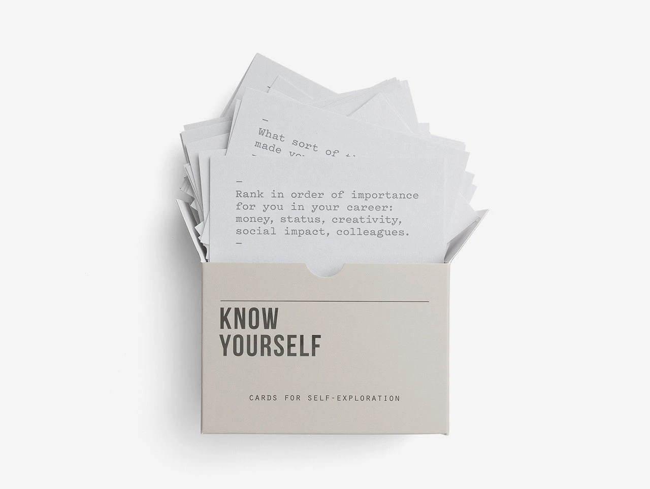 These Know Yourself Prompt Cards are designed to assist us in a journey of self-knowledge. They present us with a range of ideas and questions that encourage self-reflection, allowing us to become a little more aware of what we really need and what our priorities and potential might be. Each card carries an exercise on one side and a piece of analysis on the reverse to help you gain insight and clarity on that ever elusive subject: yourself. The design is graphically minimal, using neutral colours and a nostalgic Swiss 1950s typeface to set the tone for uncluttered thinking.